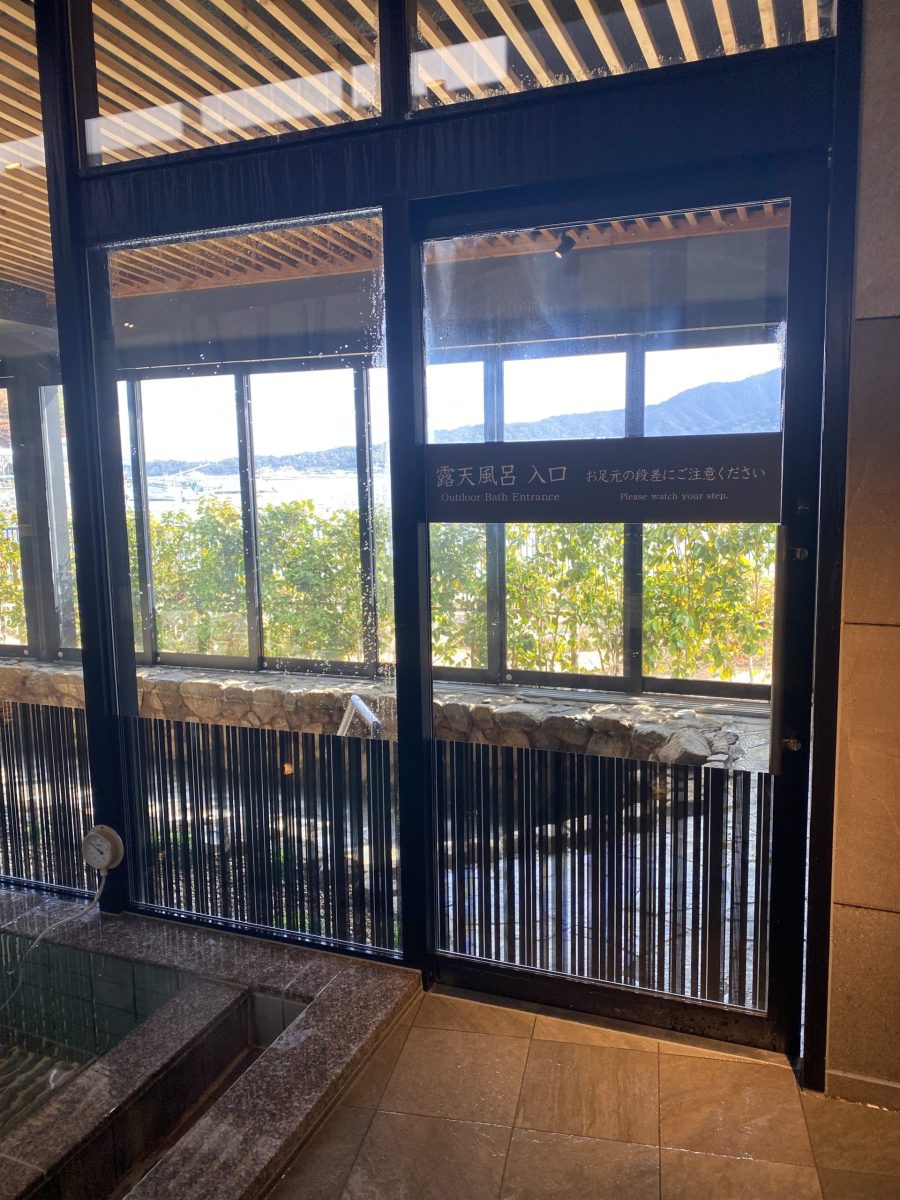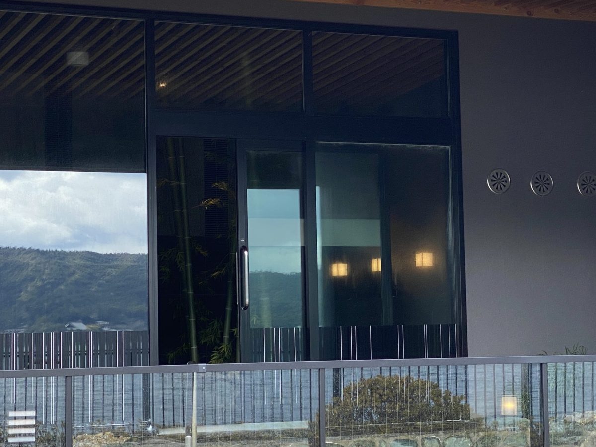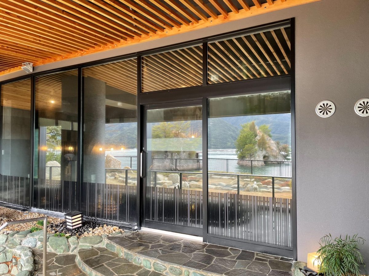 アルミ製建具(店舗用フロントサッシ) 商業施設・店舗 グランヴィリオホテル宮島 和蔵 様 廿日市市宮島口西1丁目1-37のグランヴィリオホテル宮島 和蔵 様の露天風呂入口の引戸+FIX窓を製作しました。 『内観』 『外観』