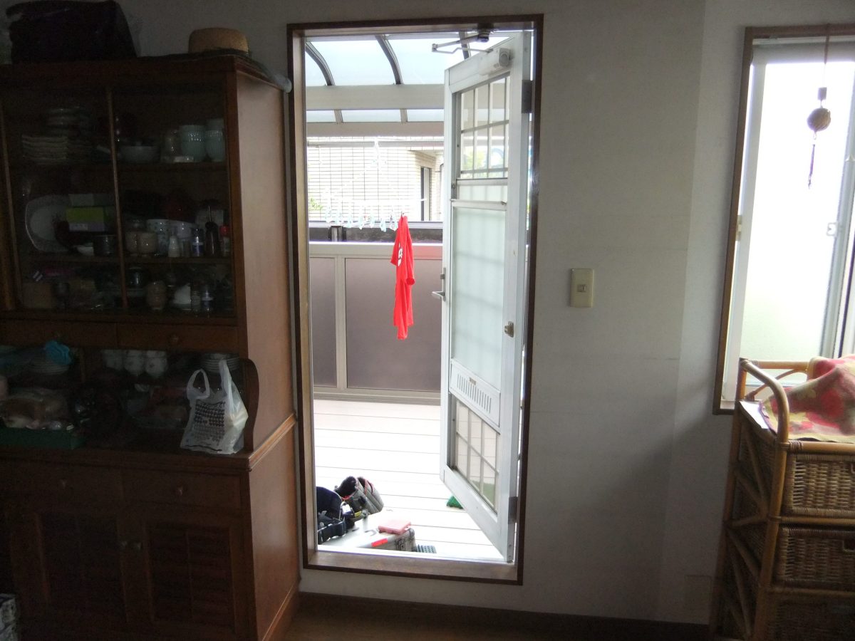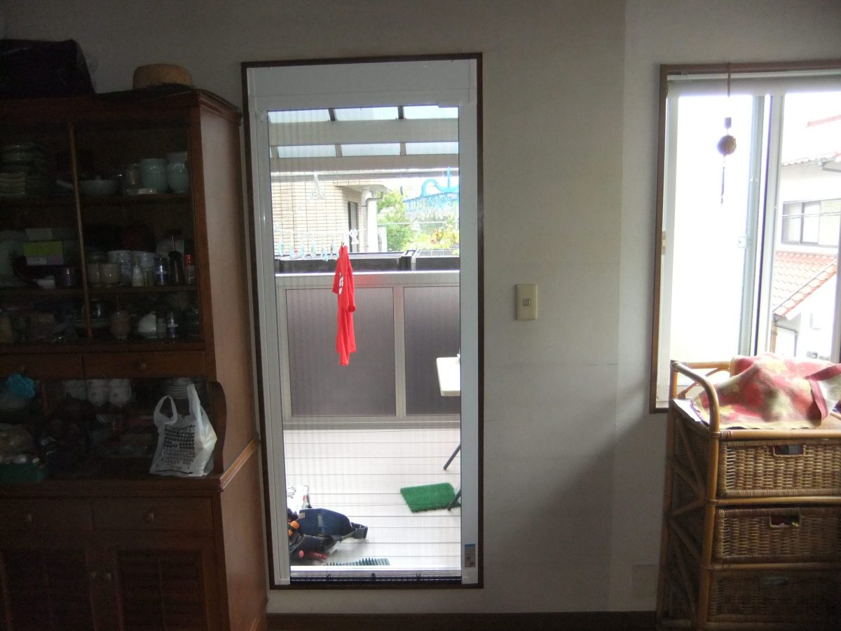 既設のベランダの出入り口ドアに、プリ-ツ網戸を取り付けました。
